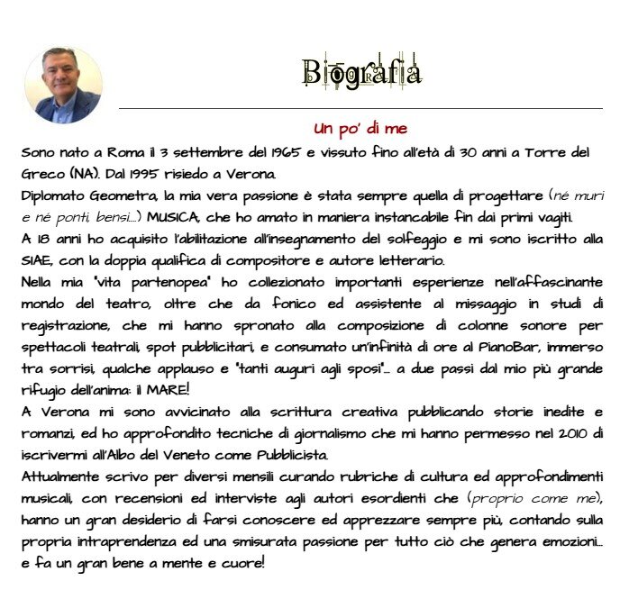 Sono nato a Roma il 3 settembre del 1965 e vissuto fino all'età di 30 anni a Torre del Greco (NA). Dal 1995 risiedo a Verona.